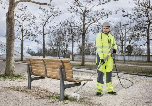 The HDS 1000 De Weed is a high-performance hot water high-pressure cleaner designed to maintain consistently high temperatures of up to 98°C. Ideal for mobile weed removal, it also effectively reduces surface-borne viruses, ensuring superior hygiene and efficiency.