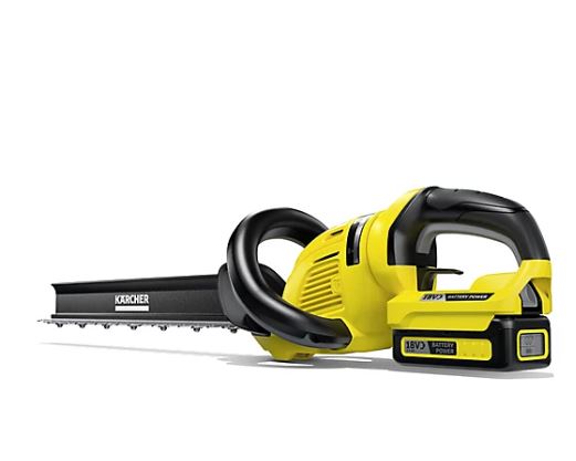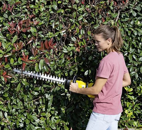 The HGE 18-50 Cordless Hedge Trimmer is designed for ease and precision. Featuring a 180° rotating handle and a practical cutting sweeper, it ensures safe and efficient operation. The trimmer comes complete with a battery and a fast charger for added convenience.