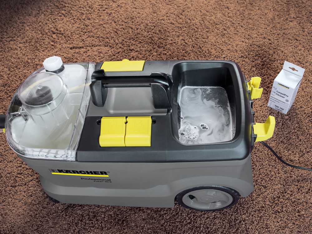 The Spray Extraction Kärcher Puzzi 10/2 Advanced is a high-performance cleaner, featuring 2-bar spray pressure, a flexible suction tool, and an advanced defoamer system for efficient deep cleaning.
